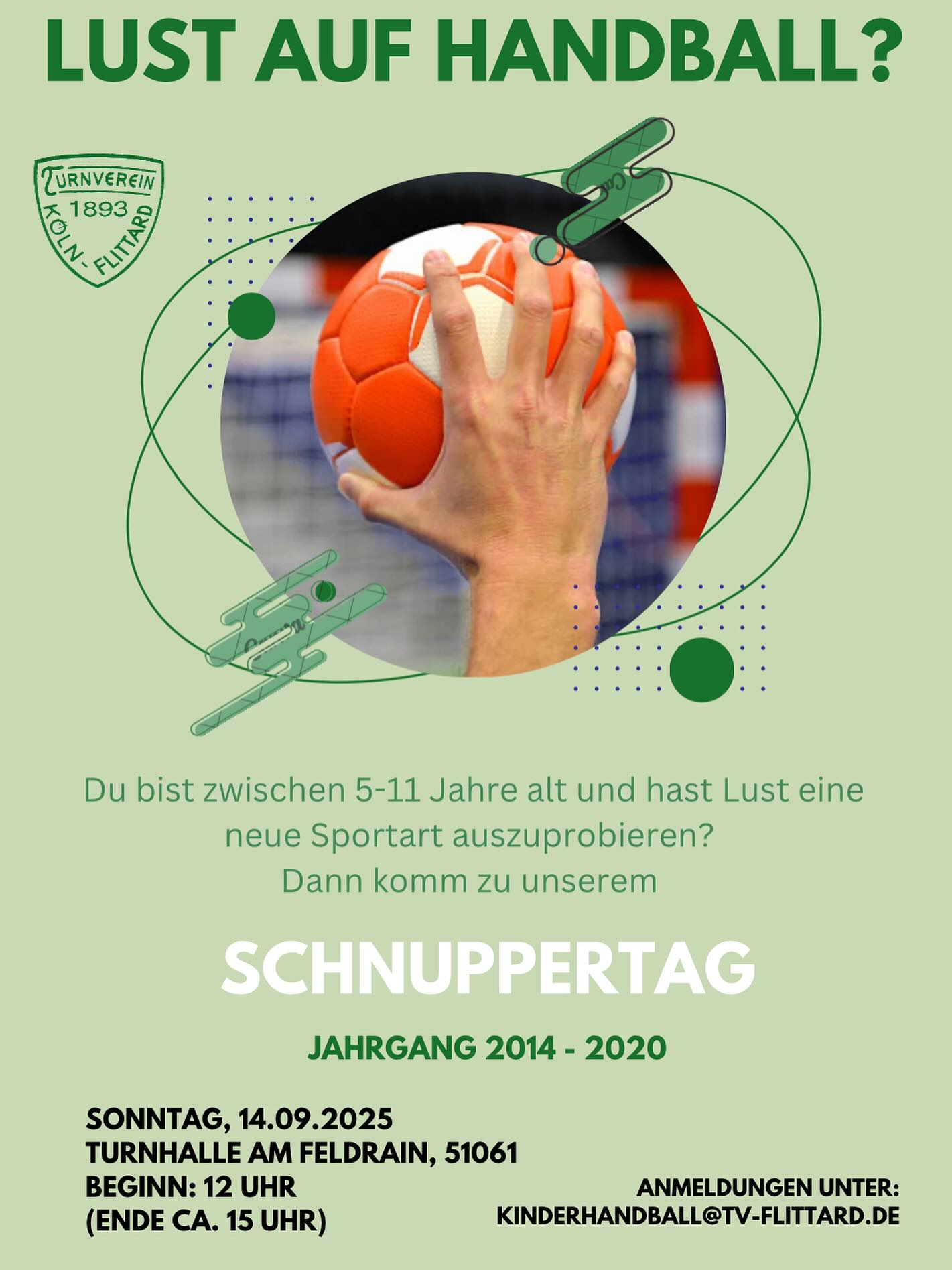 Wir möchten Kinder- und Jugendhandball fördern! Deshalb veranstalten wir am 14.09.2025 einen Handball-Schnuppertag! Über zahlreiche Anmeldungen der Jahrgänge 2014-2020 freuen wir uns sehr, egal ob weiblich oder männlich!
