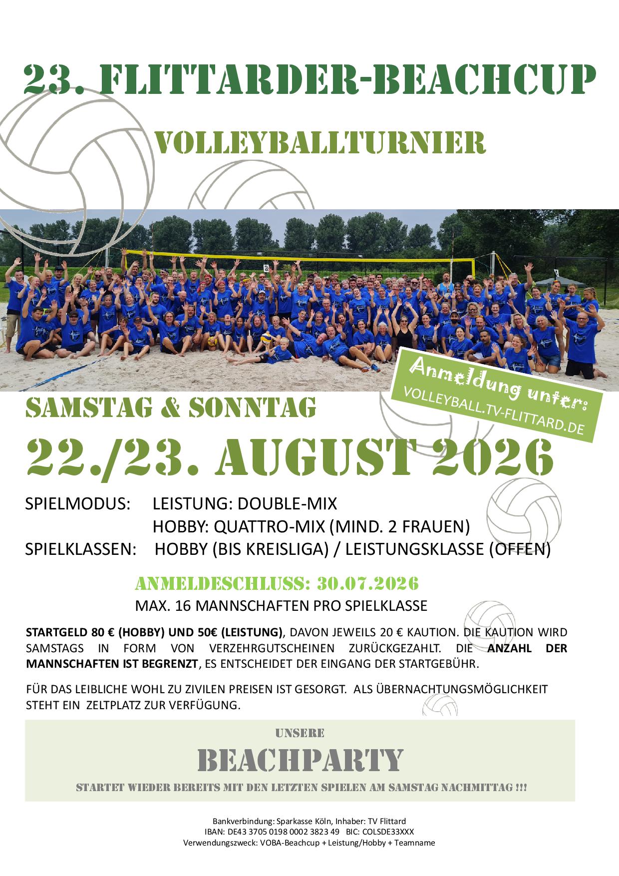 Am 22. und 23. August 2026 tragen wir auf der Beachsportanlage in Köln-Flittard unseren 23. Volleyball-Beachcup aus.